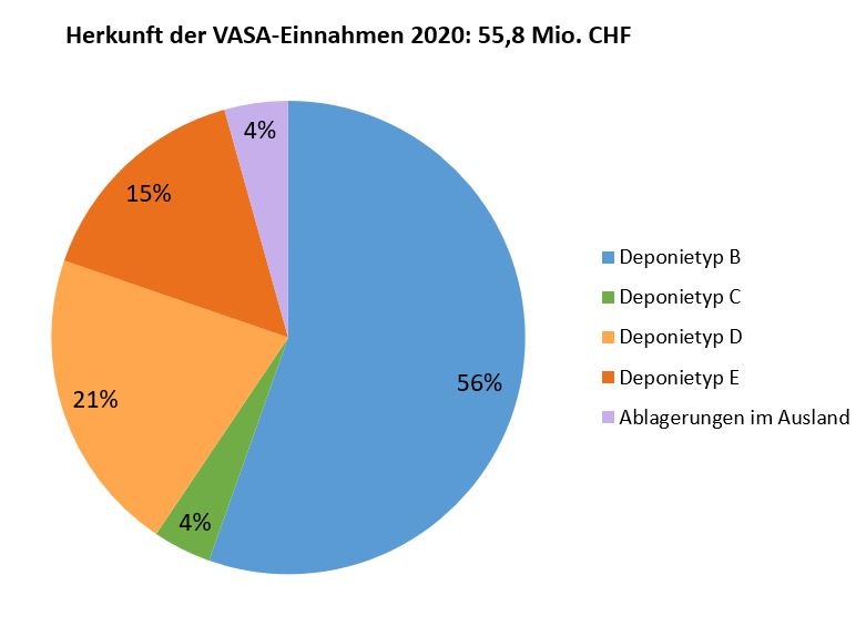 Gemäss der Verordnung über die Abgabe zur Sanierung von Altlasten (VASA) wird auf Abfälle, die auf Schweizer Deponien abgelagert oder zur Ablagerung ins Ausland exportiert werden, eine Gebühr erhoben. Im Jahr 2020 betrugen die Einnahmen 55,8 Millionen Franken. Die Deponien des Typs B steuerten mit 30,9 Millionen den grössten Anteil bei. Deponien des Typs C trugen 2,2 Millionen zum VASA-Fonds bei, Deponien des Typs D 11,6 Millionen und Deponien des Typs E 8,5 Millionen Franken. Die VASA-Einnahmen aus den Ablagerungen im Ausland betrugen 2,4 Millionen Franken (prozentuale Aufteilung siehe Abb. 1).