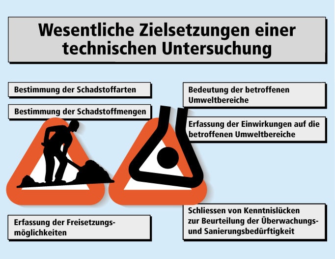 Die technische Untersuchung hat zum Ziel, die bereits vorliegenden Angaben mit Messungen so weit zu ergänzen, dass die Behörde beurteilen kann, ob der Standort saniert oder überwacht werden muss oder ob eine weitere Bearbeitung nicht sogar ganz entfallen kann. Sie soll allerdings nicht mit grossem technischem und finanziellem Aufwand eine detaillierte Gefährdungsabschätzung des Standortes produzieren; dies wird Aufgabe der allenfalls nachfolgenden Detailuntersuchung sein.