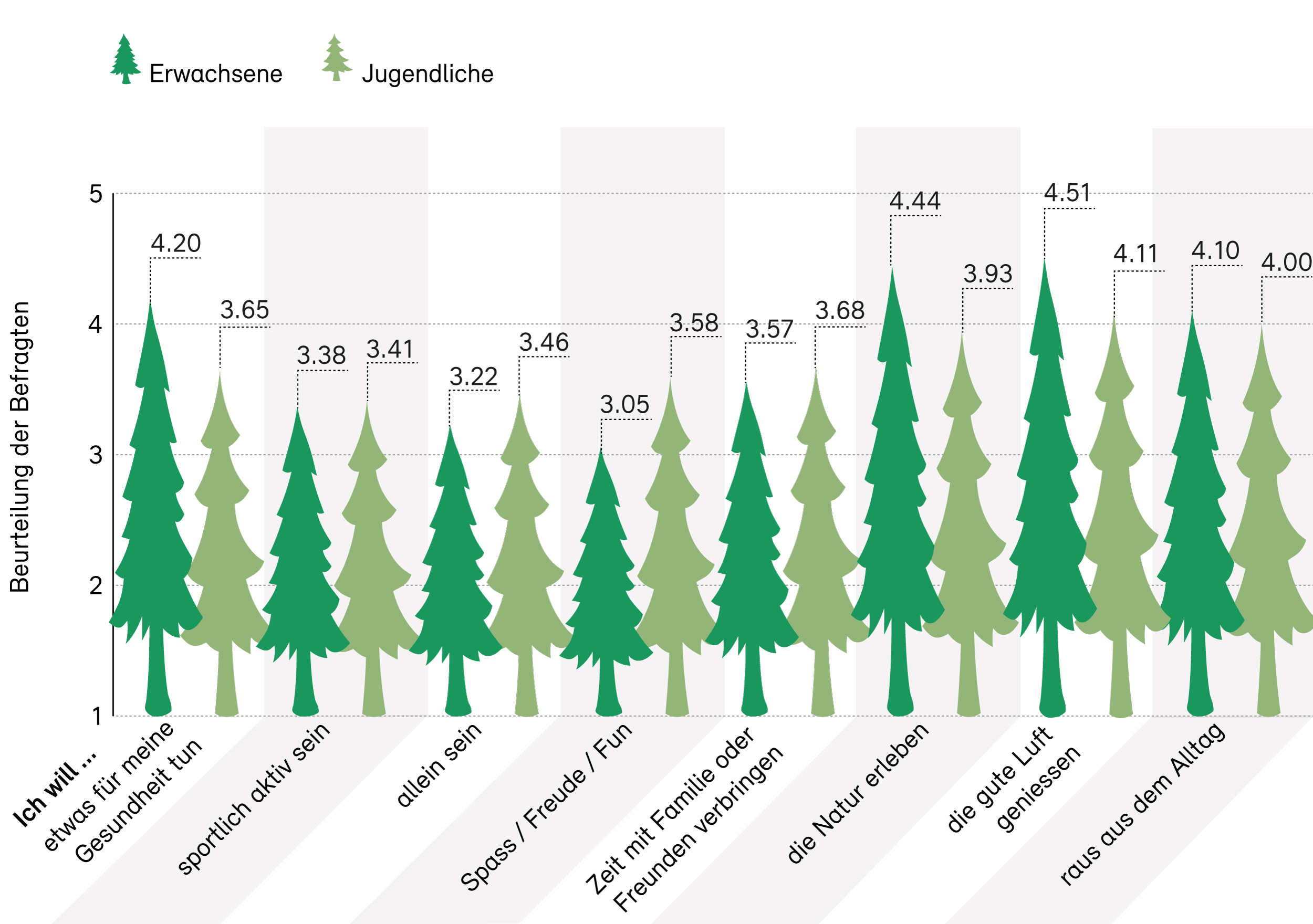 Die Schweizer Bevölkerung schätzt den Wald sehr. Über 95 % der befragten Personen gaben in der Bevölkerungsumfrage Waldmonitoring soziokulturell (WaMos 3, 2022) an, den Wald mehr oder weniger regelmässig zu besuchen. Zwar dauert der durchschnittliche Aufenthalt im Wald weniger lang als noch vor zehn Jahren, dafür gehen die Leute häufiger in den Wald. Eine spannende Erkenntnis ist, dass Erlebnisse aus der Kindheit das Verhältnis zum Wald bis spät ins Erwachsenenalter prägen. Am häufigsten suchen die Menschen den Wald auf, um zu spazieren und zu wandern; die Natur zu erleben steht an zweiter Stelle, dicht gefolgt von der Suche nach Ruhe bzw. dem Wunsch, einfach «zu sein» und «die Seele baumeln zu lassen».
