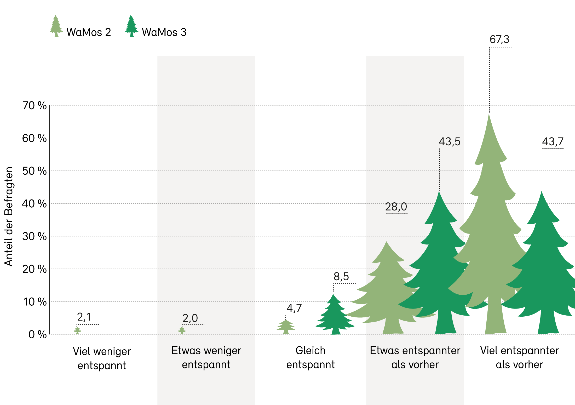 Die Resultate von WaMos 3 belegen, dass der Wald einen wichtigen Beitrag zum Wohlbefinden und zur Gesundheit der Bevölkerung beiträgt. Die Mehrheit der Personen kann sich im Wald gut erholen fühlt sich nach dem Waldbesuch entspannter als zuvor.