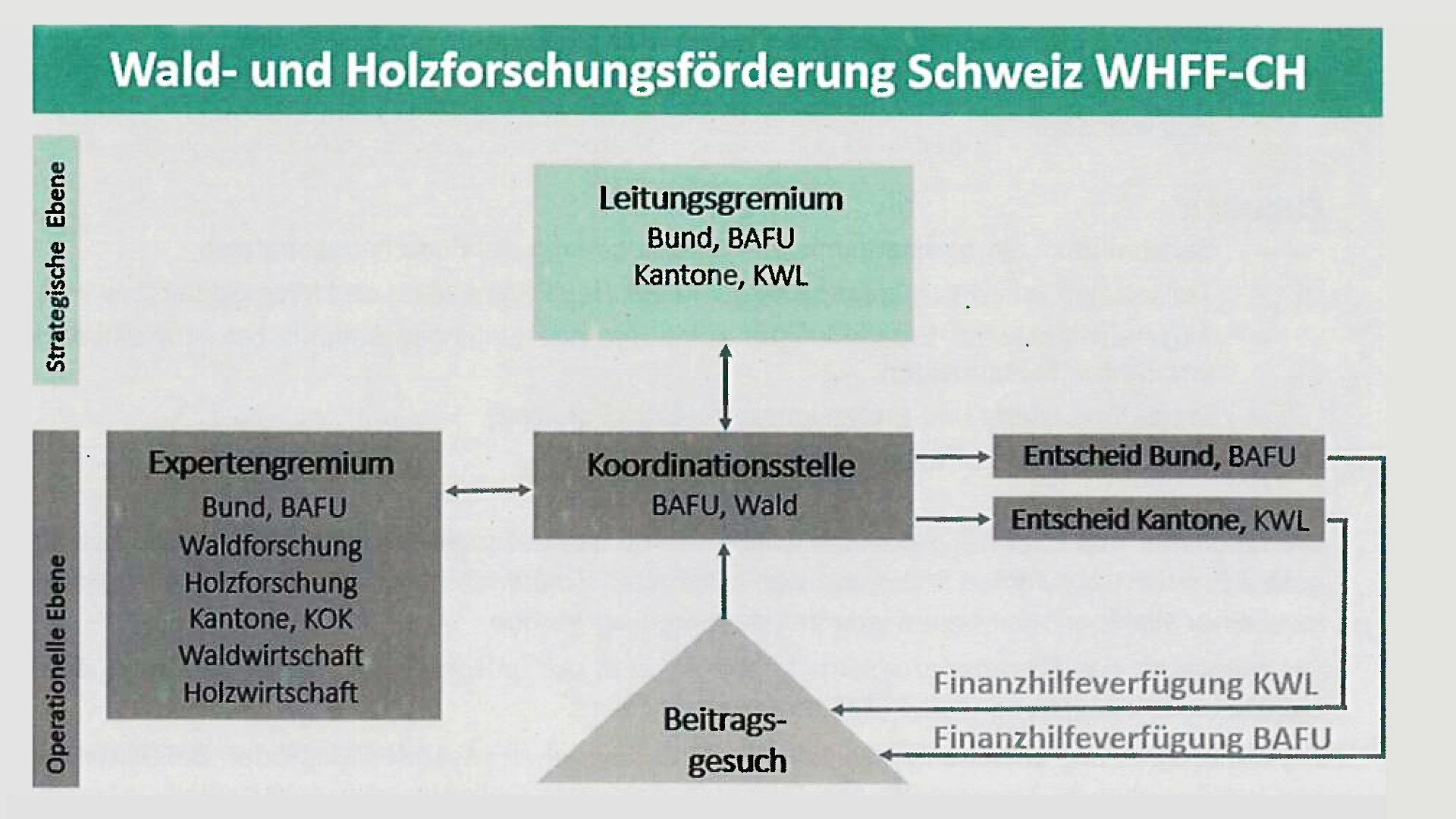 Die Wald- und Holzforschungsförderung Schweiz WHFF-CH wird durch den Bund koordiniert. Im Leitungsgremium sind Bund und Kantone vertreten, sie entscheiden über die Projektunterstützung. Das Expertengremium beurteilt Projektgesuche gemäss «Merkblatt WHFF-CH». Bund und Kantone erstellen ihre Verfügungen separat. Jährlich stehen der WHFF-CH insgesamt CHF 770'000 zur Verfügung. Der Bund finanziert CHF 470'000 pro Jahr. Die Kantone unterstützen jährlich Projekte im Umfang von CHF 300'000.