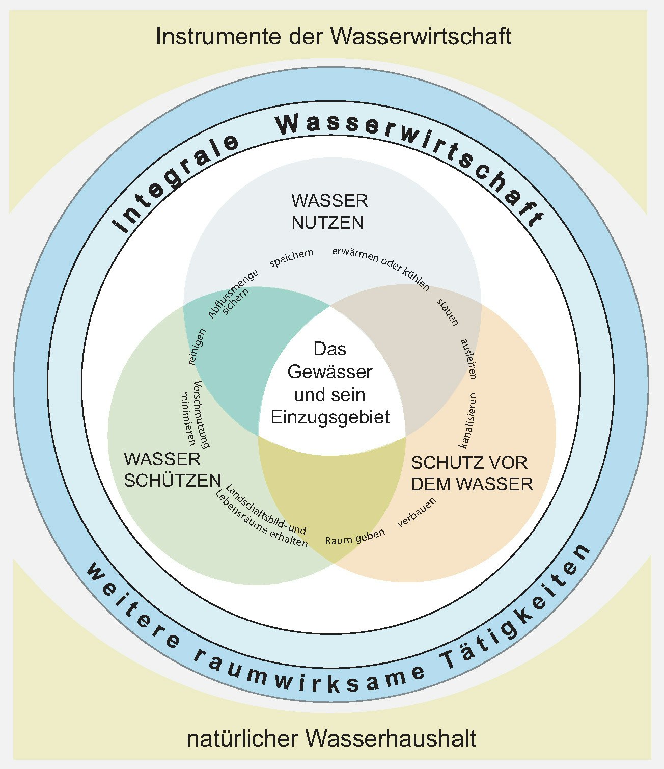 Aus einer übergeordneten Perspektive betrachtet die integrale Wasserwirtschaft alle Aktivitäten des Menschen zum Schutz des Wassers, zur Nutzung sowie zum Schutz vor den Gefahren des Wassers. Damit diese drei Hauptziele wasserwirtschaftlicher Tätigkeiten in Einklang gebracht werden können, stehen verschiedene übergeordnete Instrumente zur Verfügung.