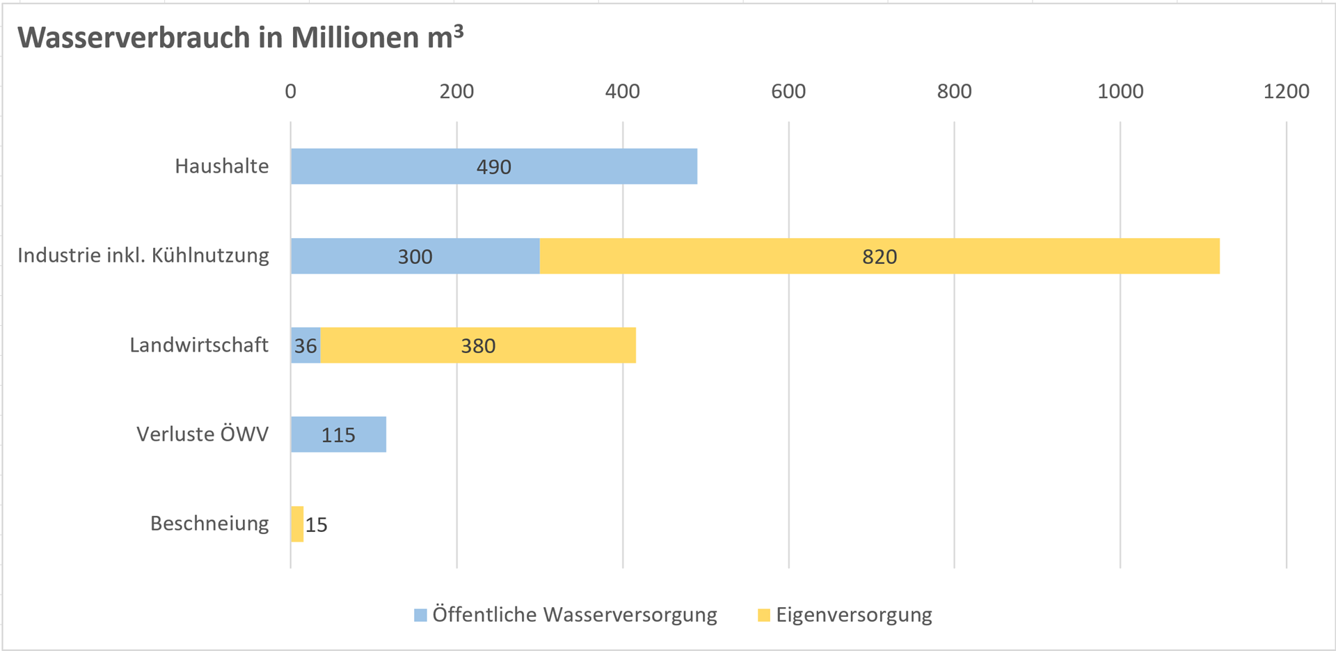 Zum Wasserverbrauch aus der Eigenversorgungen durch Industrie, Gewerbe und den Dienstleistungssektor liegt eine einmalige Erhebung und Hochrechnung aus dem Jahr 2006 vor. 2006 betrug der Wasserverbrauch 1'120 Mio. m3. Zwei Drittel davon werden zur Kühlung und Klimatisierung verwendet. Hinzu kommt die Wassermenge der Flusswasserkühlung der Kernkraftwerke von rund 1'600 Mio. m3 pro Jahr.