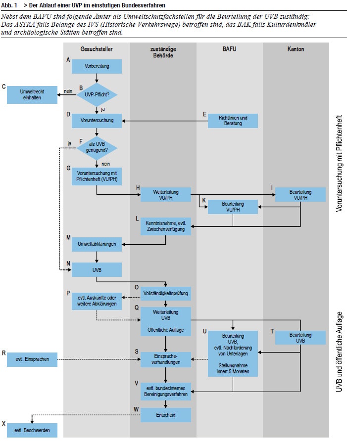 Die untenstehende Abbildung stammt aus dem UVP-Handbuch und zeigt schematisch den UVP-Ablauf im einstufigen Bundesverfahren: