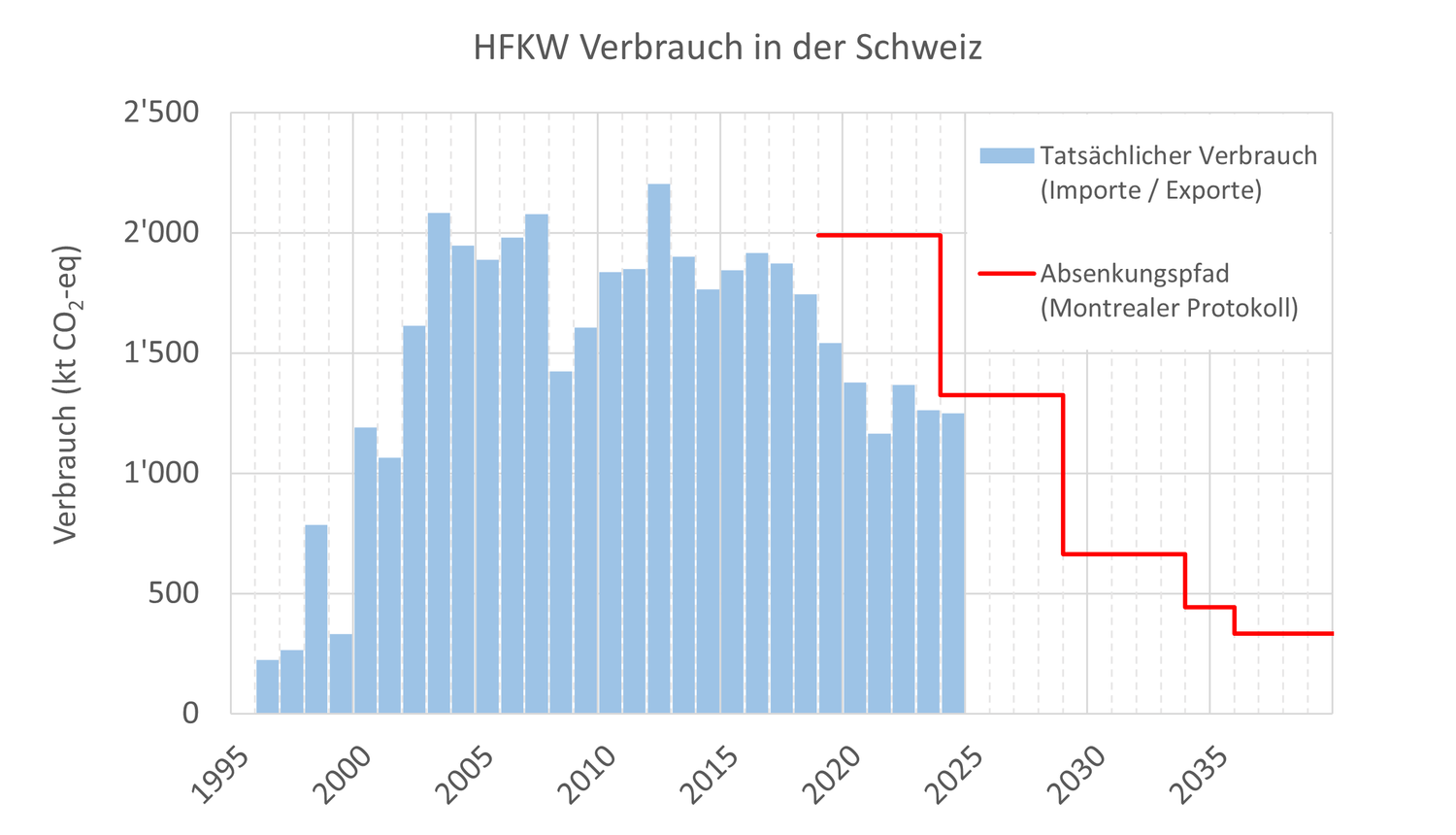 Die Reduktion des HFKW-Verbrauchs kann durch verschiedene Alternativtechnologien erreicht werden, so etwa durch den Einsatz von natürlichen Stoffen (Kohlenwasserstoffe, Ammoniak oder Wasser) oder auch synthetischen Produkten (z.B. teilhalogenierte Fluorolefine (HFO)). Das Abbauprodukt der HFO jedoch, die Trifluoressigsäure (TFA), weist eine pflanzentoxische Wirkung und eine extrem lange Lebensdauer in Oberflächengewässern auf und stellt damit ein neues Umweltrisiko dar. Deshalb muss aus Sicht der Schweiz verstärkt auf die Entwicklung von Technologien mit natürlichen Alternativen gesetzt werden.