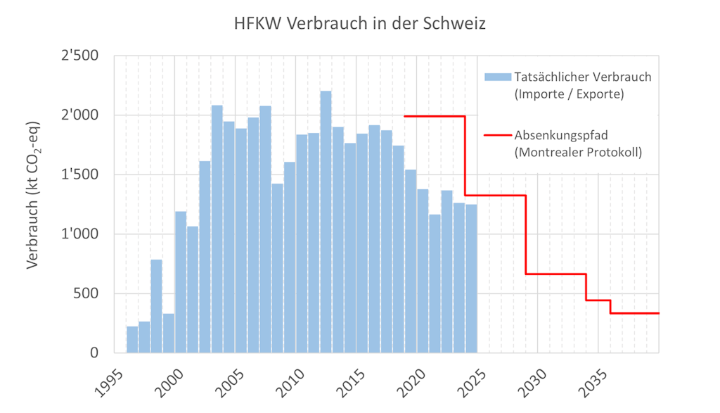 HFKW dürfen insbesondere nur noch dort eingesetzt werden, wo nach dem Stand der Technik keine Alternativen verfügbar sind. Der in der Grafik abgebildete Absenkungspfad zeigt die so angestrebte schrittweise Reduktion des Verbrauchs von HFKW.