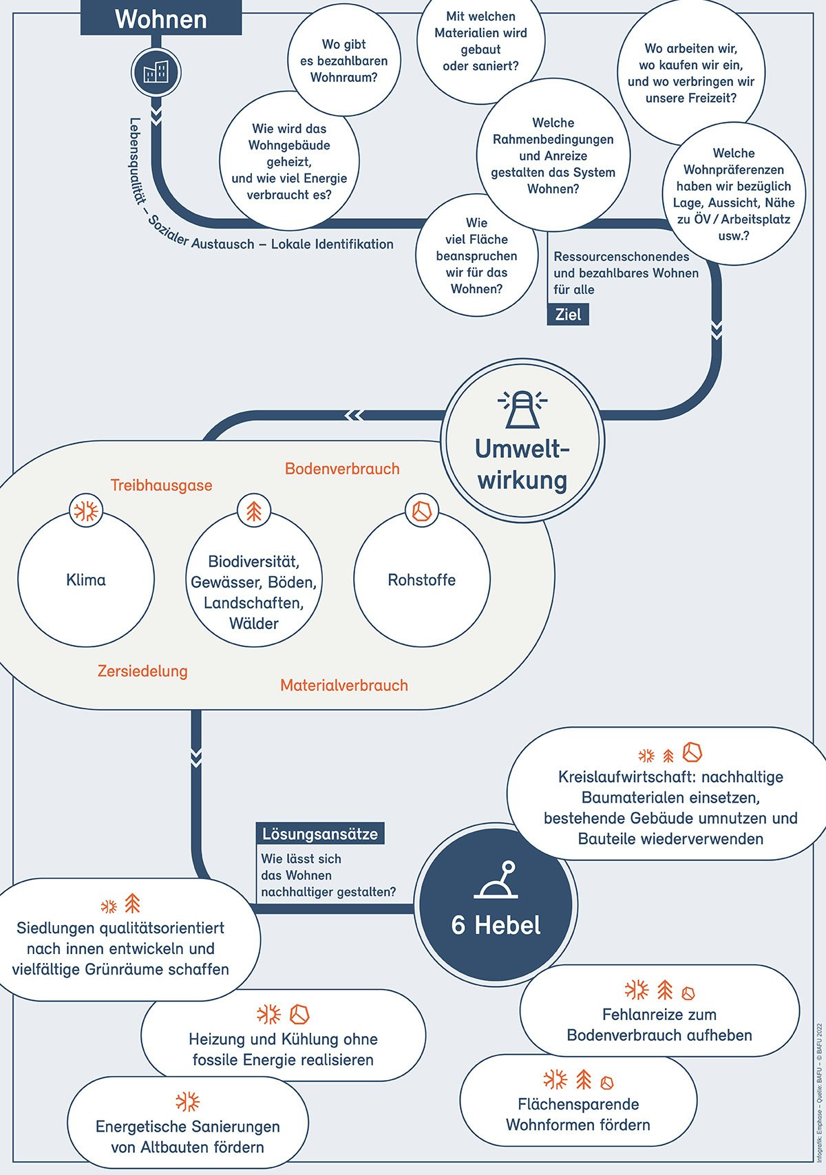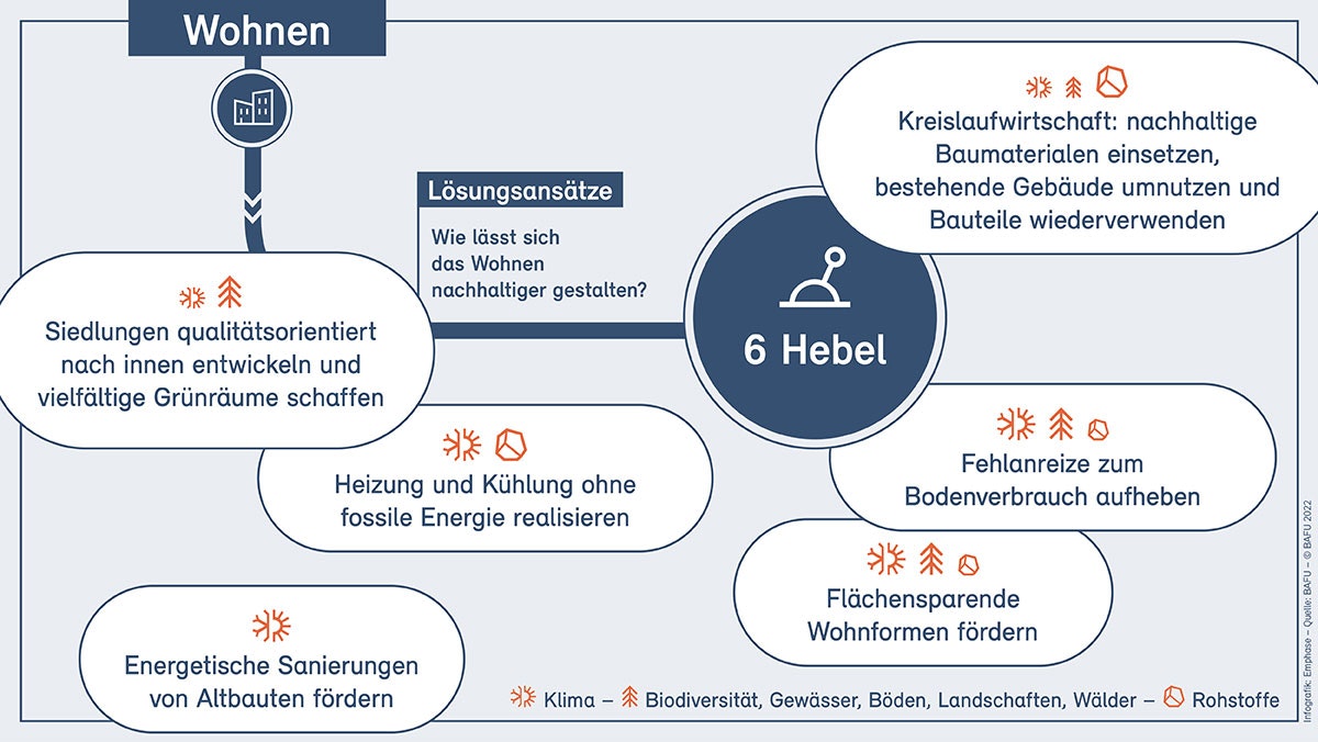 Wohnen und Bauen verbrauchen Boden, verändern die Landschaft, benötigen Material und Energie und haben Auswirkungen auf die Mobilität. Die negativen Folgen lassen sich jedoch deutlich senken durch eine qualitätsvolle Siedlungsentwicklung nach innen, die auf genügend Grünräumen, einer Weiterentwicklung und Sanierung der bestehenden Bauten, einer hohen Baukultur und auf kurzen Wegen aufbaut. Dies kommt nicht nur dem Boden, der Biodiversität und dem Klima, sondern auch der Lebensqualität zugute. Darüber hinaus haben energetische Sanierungen und umweltschonende, wiederverwendete oder rezyklierbare Baumaterialien grosses Potenzial, den Material- und Energiebedarf zu verringern.