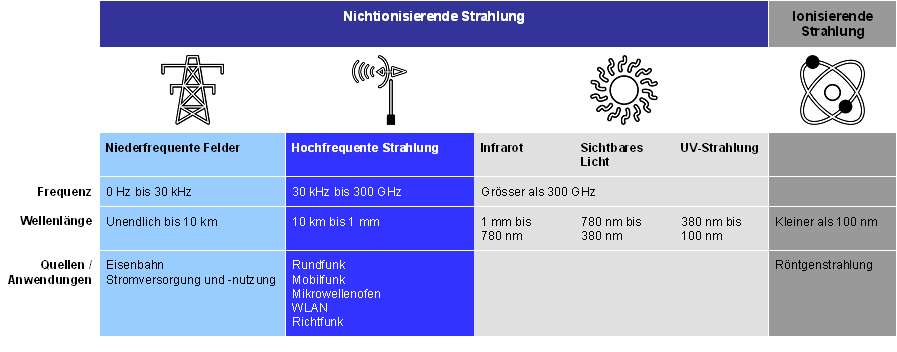 Das Wort «Elektrosmog» hat sich im deutschen Sprachraum als Sammelbezeichnung für alle technisch erzeugten elektrischen und magnetischen Felder durchgesetzt. Das Frequenzspektrum der elektromagnetischen Strahlung wird grob unterteilt in nichtionisierende und in ionisierende Strahlung. Bei der nichtionisierenden Strahlung unterscheidet man zwischen nieder und hochfrequenter Strahlung, Infrarotstrahlung, sichtbarem Licht und Ultraviolett-Strahlung.