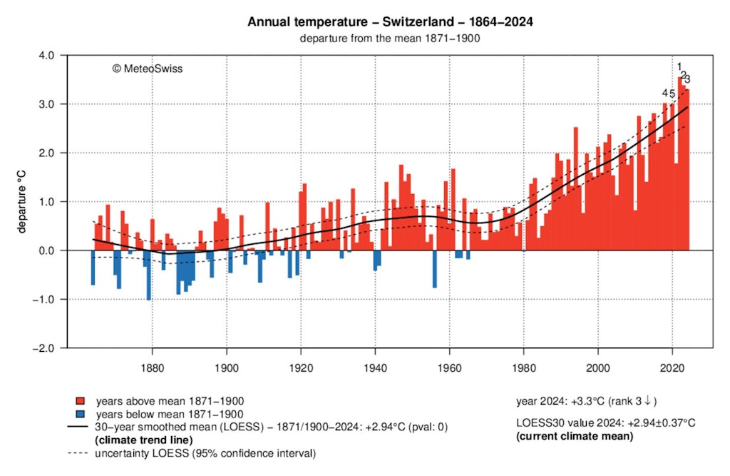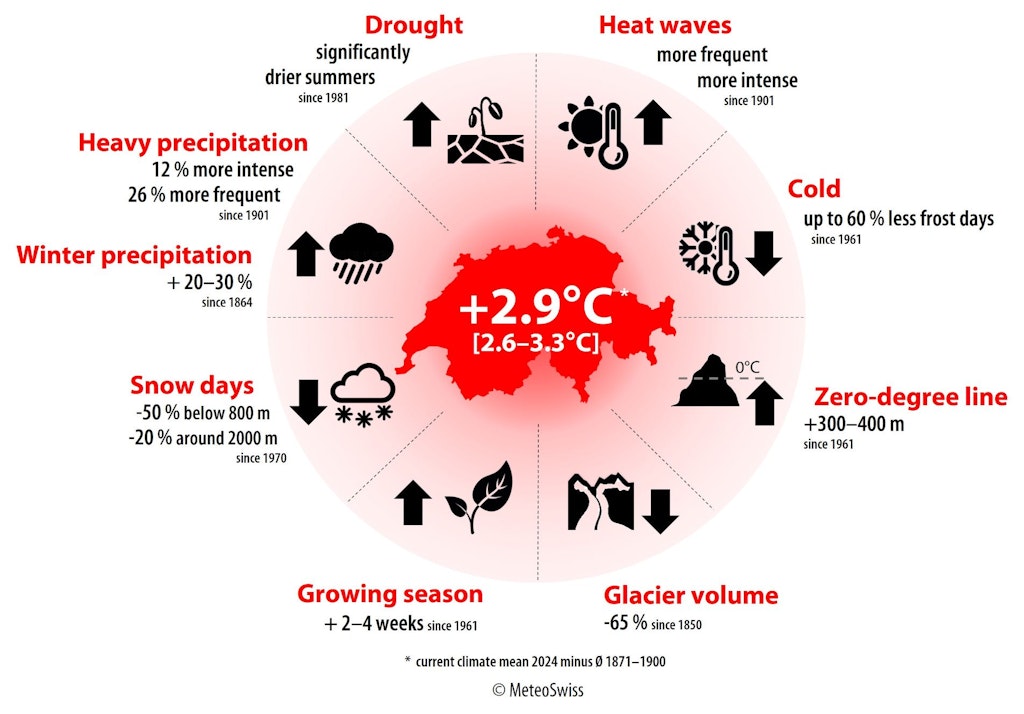 Global warming is also increasing the risk of heat waves, summer droughts and heavy precipitation in Switzerland as elsewhere.