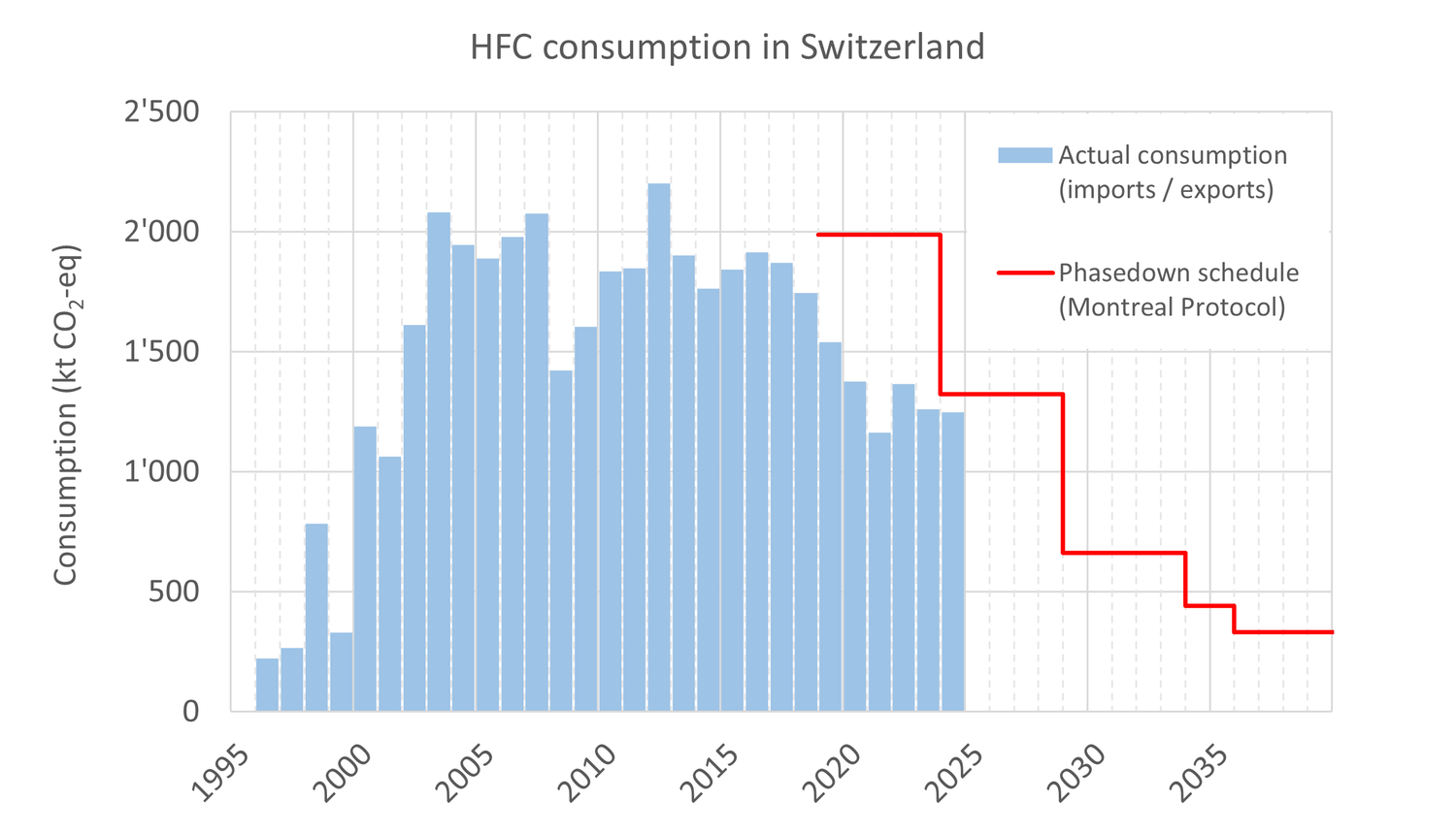 Since 1 June 2019, the import and export of hydrofluorocarbons (HFCs) has been subject to an authorization requirement pursuant to Annex F of the Montreal Protocol (Annex 1.5, numbers 4.3.1 and 5.1, ORRChem). The authorization requirement serves in particular to monitor compliance with the HFC consumption planned for Switzerland in accordance with its international obligations (see diagram).