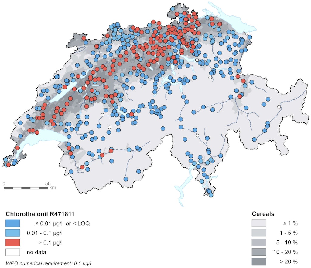 Ground water is especially affected by the metabolite chlorothalonil R471811, which exceeds 0.1 micrograms per litre at more than 60% of monitoring sites on the Swiss Plateau. Across the country, every third monitoring site is affected.