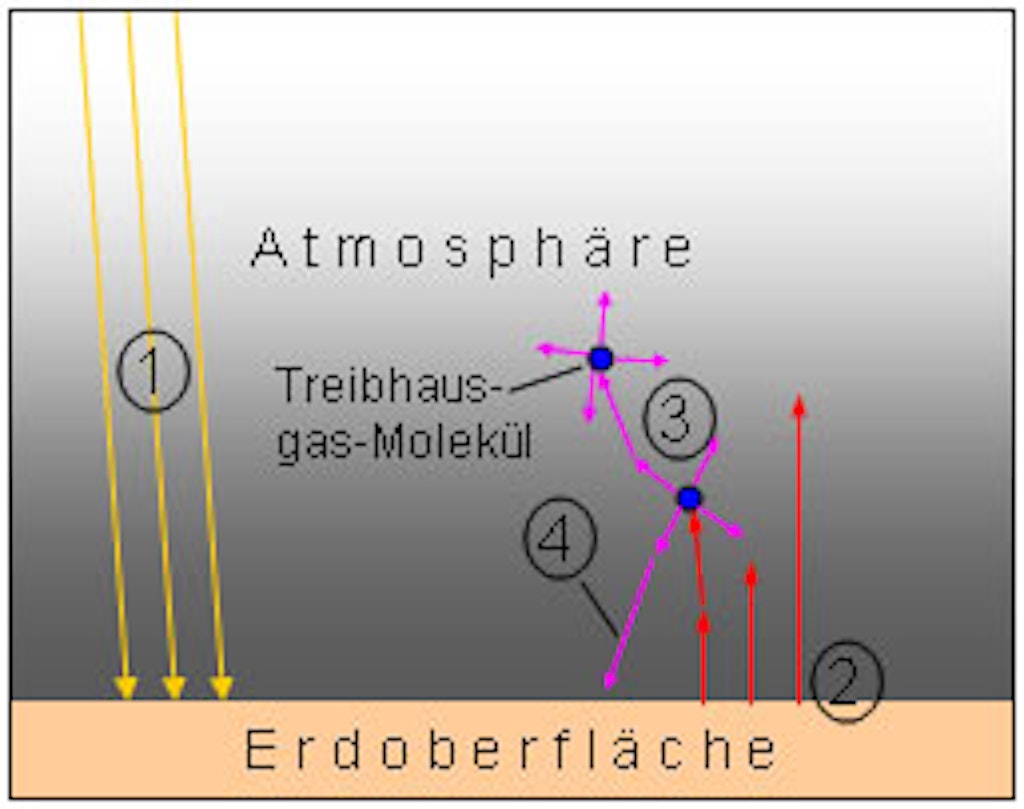 Solar radiation is absorbed by the earth’s surface which in turn releases heat radiation into the atmosphere. Greenhouse gases in the atmosphere absorb this radiation and send some of it back to earth. It is due to this reflection that the earth's surface and the lowest layer of the atmosphere heat up. The higher the concentration of greenhouse gases the greater this additional warming.