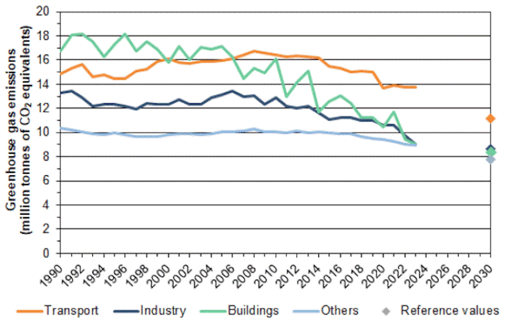 The CO2 Ordinance defines reference values for individual sectors for the maximum permissible emissions in 2030 relative to the emissions in 1990: