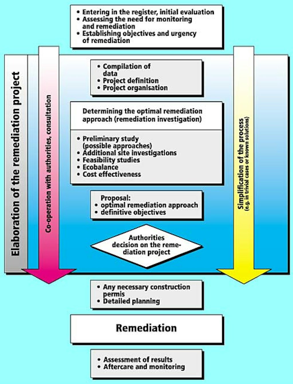 An optimal and the most sustainable approach to remediation possible requires a solid foundation: That is the purpose and function of the remediation project to be worked out by the party obliged to remediate. The remediation measures, geared to the individual case - ecologically sound, technically possible and financially bearable - are to be worked out within the remediation project. The remediation project provides the authorities with an instrument with which to assess the proposed measures and to definitively establish in consultation with the affected parties the remediation objectives and measures.