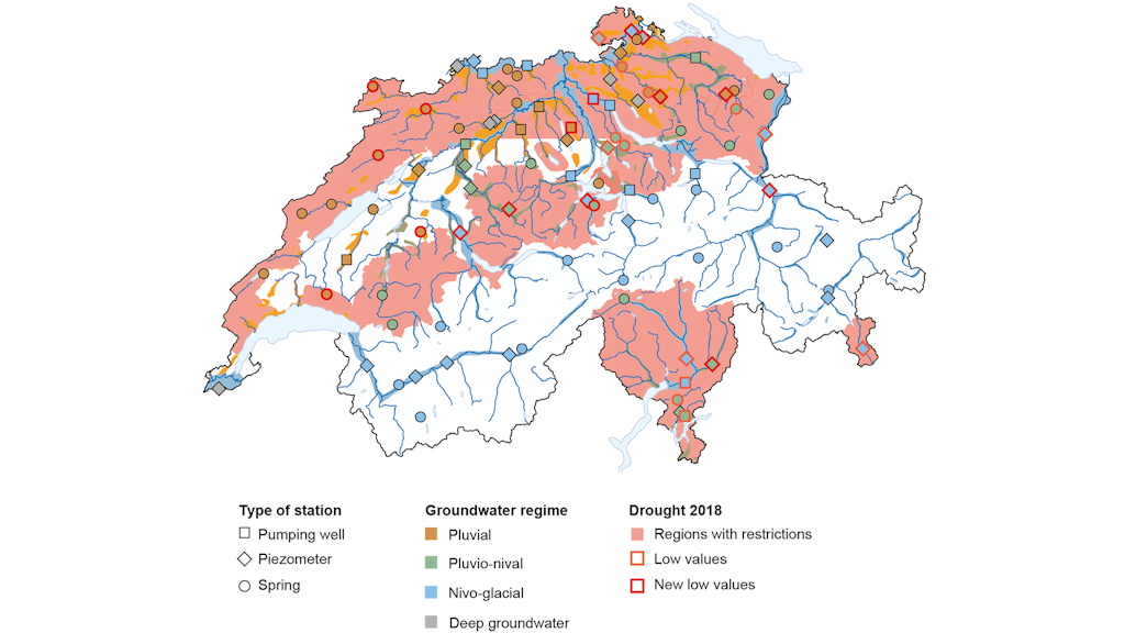 Climate change is expected to lead to longer and more frequent dry spells, making nationwide monitoring of the effects on groundwater indispensable. As part of Switzerland's national groundwater monitoring programme (NAQUA), groundwater volume and temperature are monitored continuously at around 100 sites.