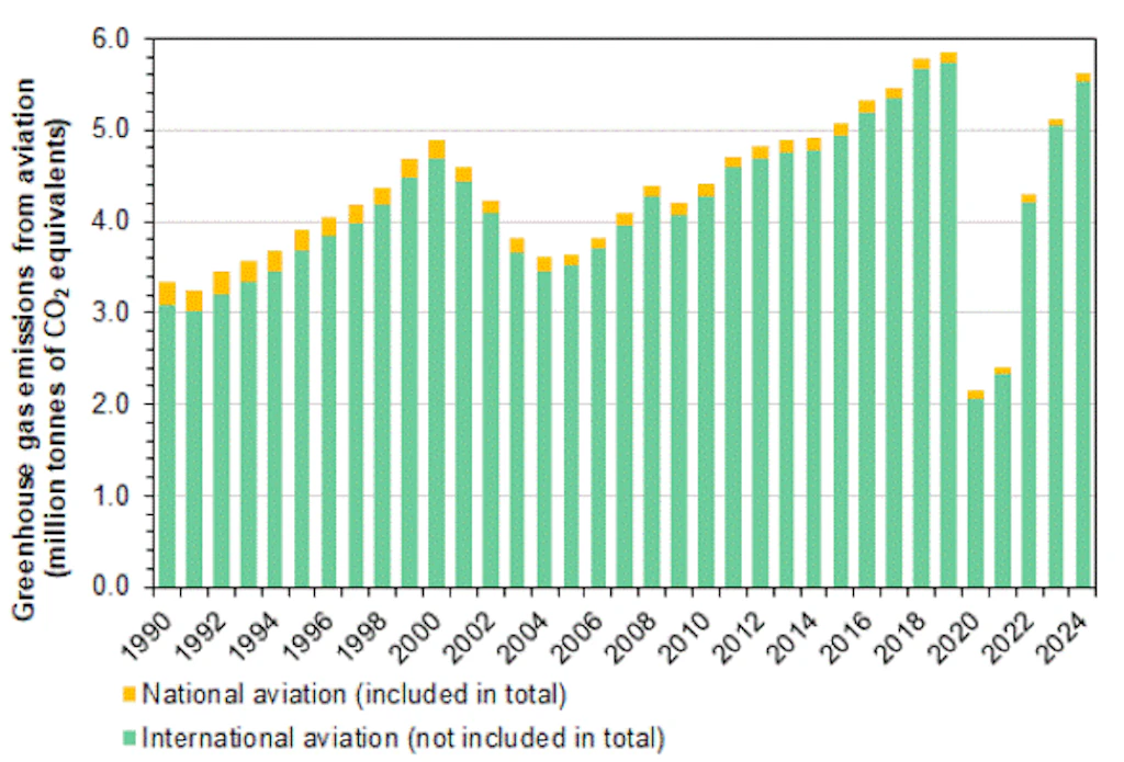 The greenhouse gas inventory has separate data for emissions from national and international aviation. Although most emissions come from international flights, the national total only includes emissions from national flights. Non-CO2 emissions increase the climate impact of aviation.