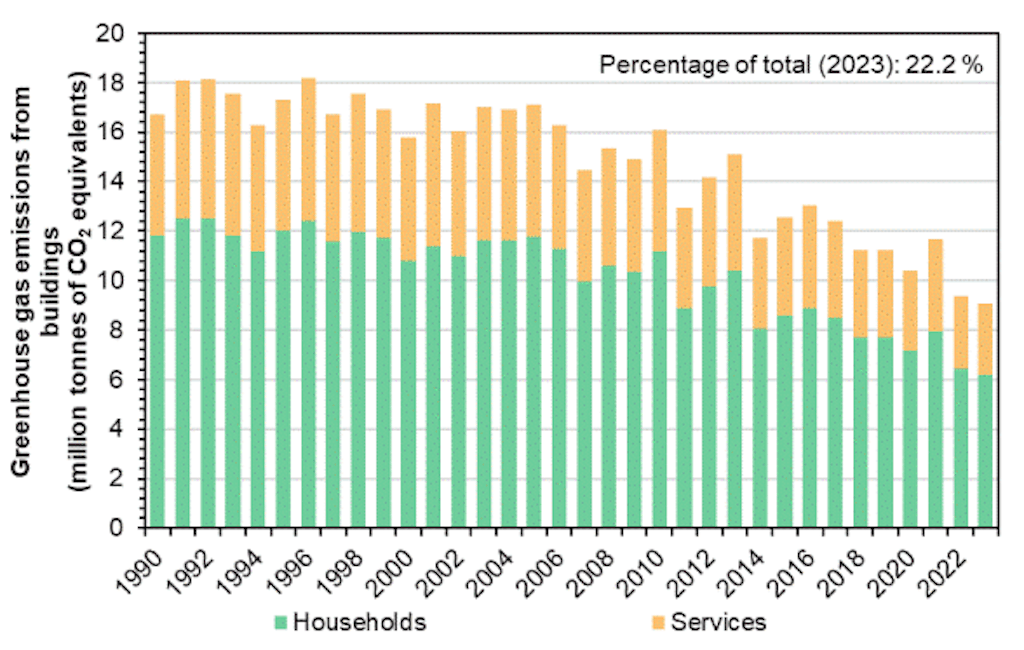 The Buildings sector summarises the emissions from households (residential buildings) and services (commercial buildings).