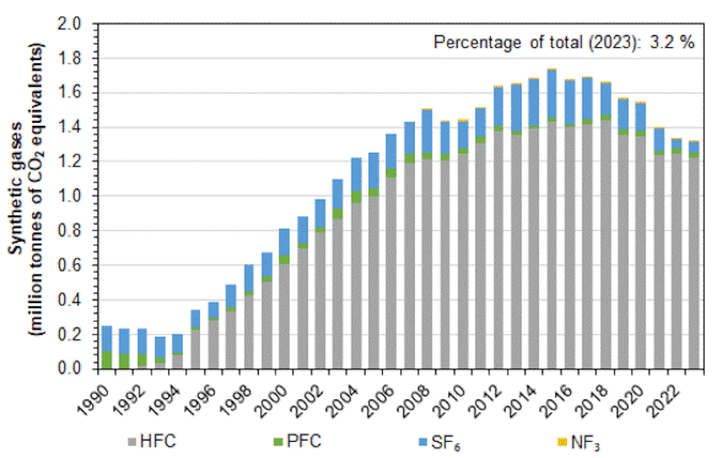 Synthetic gases include hydrofluorocarbons (HFC), perfluorocarbons (PFC), sulphur hexafluoride (SF6) and nitrogen trifluoride (NF3). Their impact on the greenhouse effect exceeds that of carbon dioxide (CO2) many times over in some cases, so even low emissions of synthetic gases are important. The sharp increase since 1994 is primarily due to the replacement of chlorofluorocarbons (CFC) with HFC. CFCs deplete the ozone layer and are powerful greenhouse gases. However, they were omitted from the Kyoto Protocol as they were already regulated in the Montreal Protocol (a ban on the use of CFCs in order to protect the ozone layer).