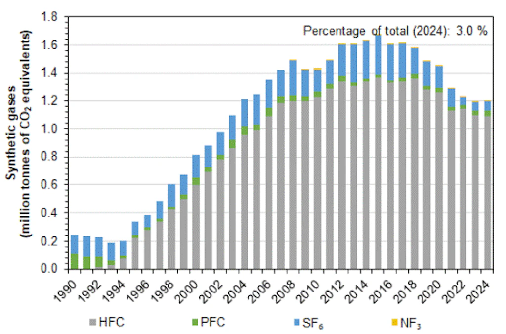 Emissions of artificially manufactured gases contribute (in some cases substantially) to the greenhouse effect. These synthetic gases are used as coolants in cold-storage rooms, refrigerators and air conditioning systems, as electrical insulators and as solvents, as well as in the production of foam materials. Thereby, unintended emissions into the atmosphere occur.