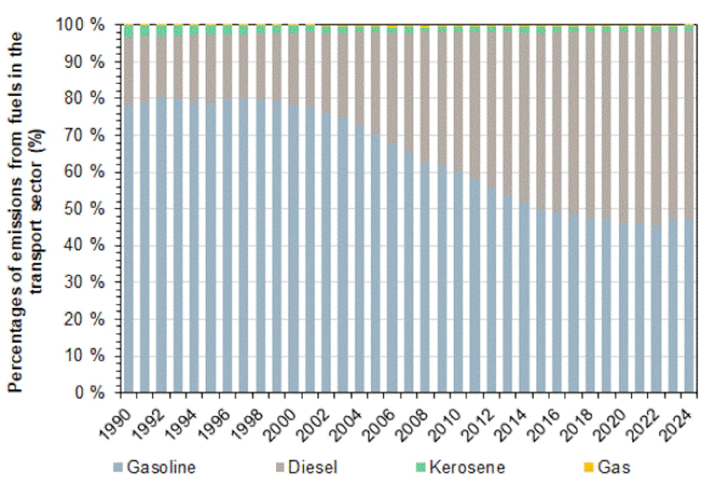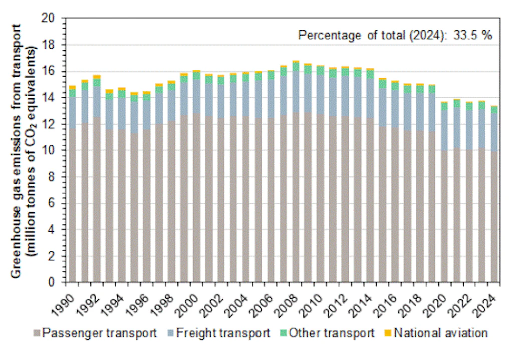 The largest shares of emissions in the Transport sector come from passenger transport (cars, motorbikes, coaches), followed by freight transport (trucks and delivery vans). The other forms of transport (rail, boats/ships, buses, pipeline transport, military including military flights, fuel tourism and statistical differences) and national aviation (civil domestic flights) contribute less to Transport sector emissions. In line with the guidelines of the UN Climate Convention, emissions from international aviation and navigation are not included in the national total emissions or in the Transport sector shown here. Emissions from construction and industrial machinery are allocated to the Industry sector. Emissions from agricultural and forestry vehicles and machinery are allocated to the Agriculture sector.