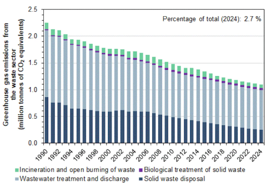The Waste sector shows the greenhouse gas emissions produced by waste management (not including waste incineration). These mainly come from landfills and wastewater treatment plants. Emissions from the incineration of waste in municipal solid waste and special waste incineration plants and as an alternative fuel in industrial furnaces are allocated to the Industry sector.