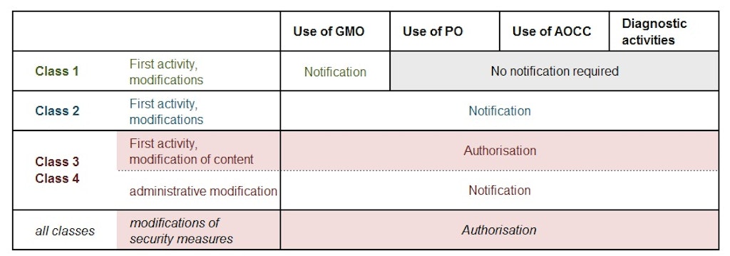 Class 3 and 4 activities and the alteration, substitution or omission of particular safety measures are subject to authorisation, and may be carried out only after the competent authority (Federal Office for the Environment FOEN or Federal Office of Public Health FOPH) has granted authorisation.