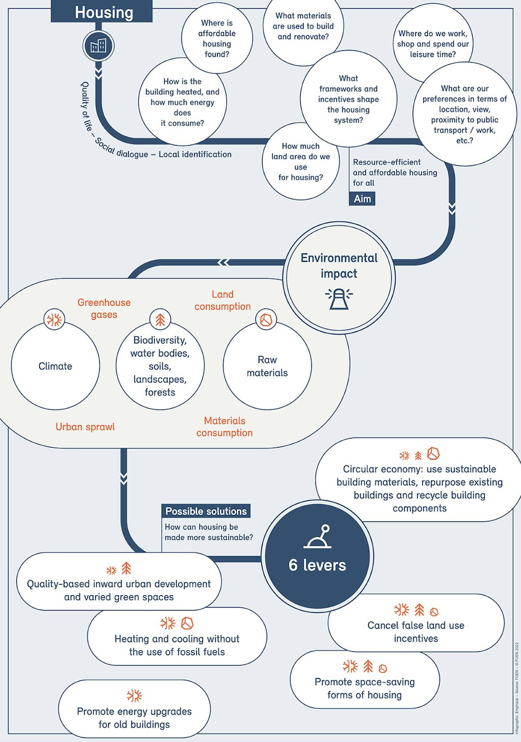 Housing is after nutrition and before mobility one of the areas of consumption and production with the greatest effects on the environment. However, the negative effects could be reduced significantly through various levers and approaches.