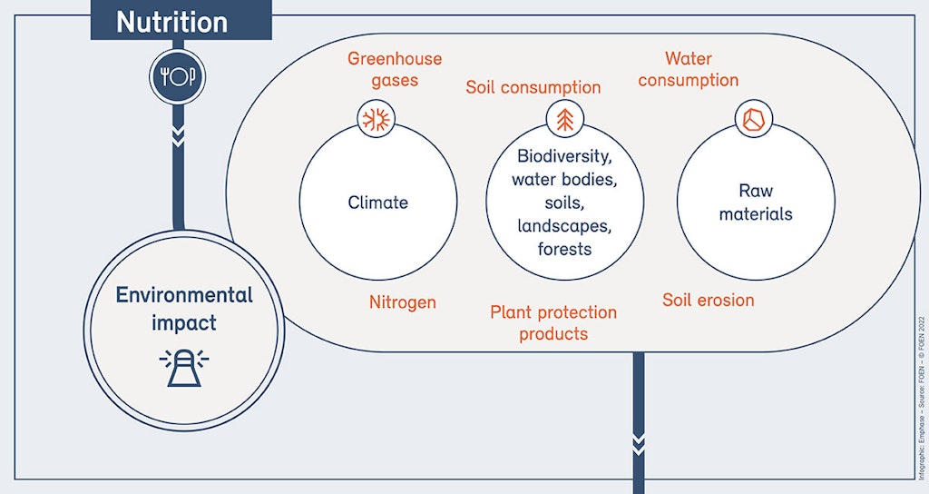 Food represents pleasure, identity and tradition. Agricultural production, industrial food processing and packaging, distribution, preparation and consumption all have an impact on the environment both locally and globally. The principal problems include greenhouse gases, nitrogen, fertiliser and PPP emissions, and soil consumption.