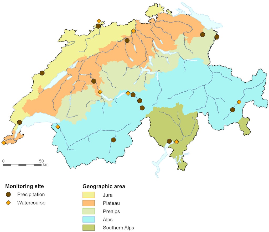 The 13 precipitation monitoring sites are distributed across the different climatic regions of Switzerland (Jura, Plateau, Alps). They also cover the elevations along a NW/SE profile from Berne (541 m a.s.l.) over the Grimsel Pass (1950 m a.s.l.) to Locarno (379 m a.s.l.). The monitoring sites are situated close to the MeteoSwiss meteorological monitoring sites where other parameters such as air temperature and vapour pressure are collected.