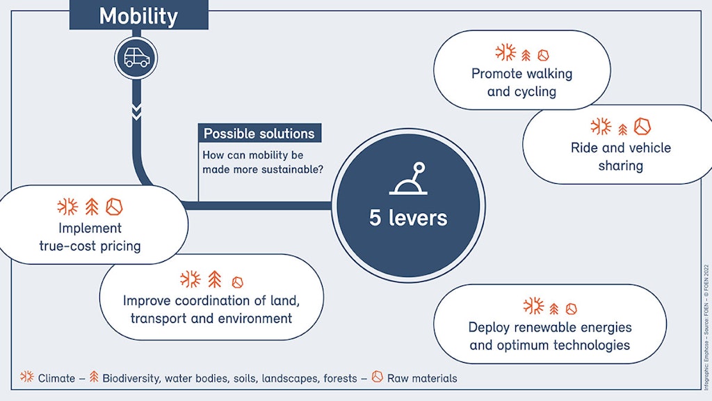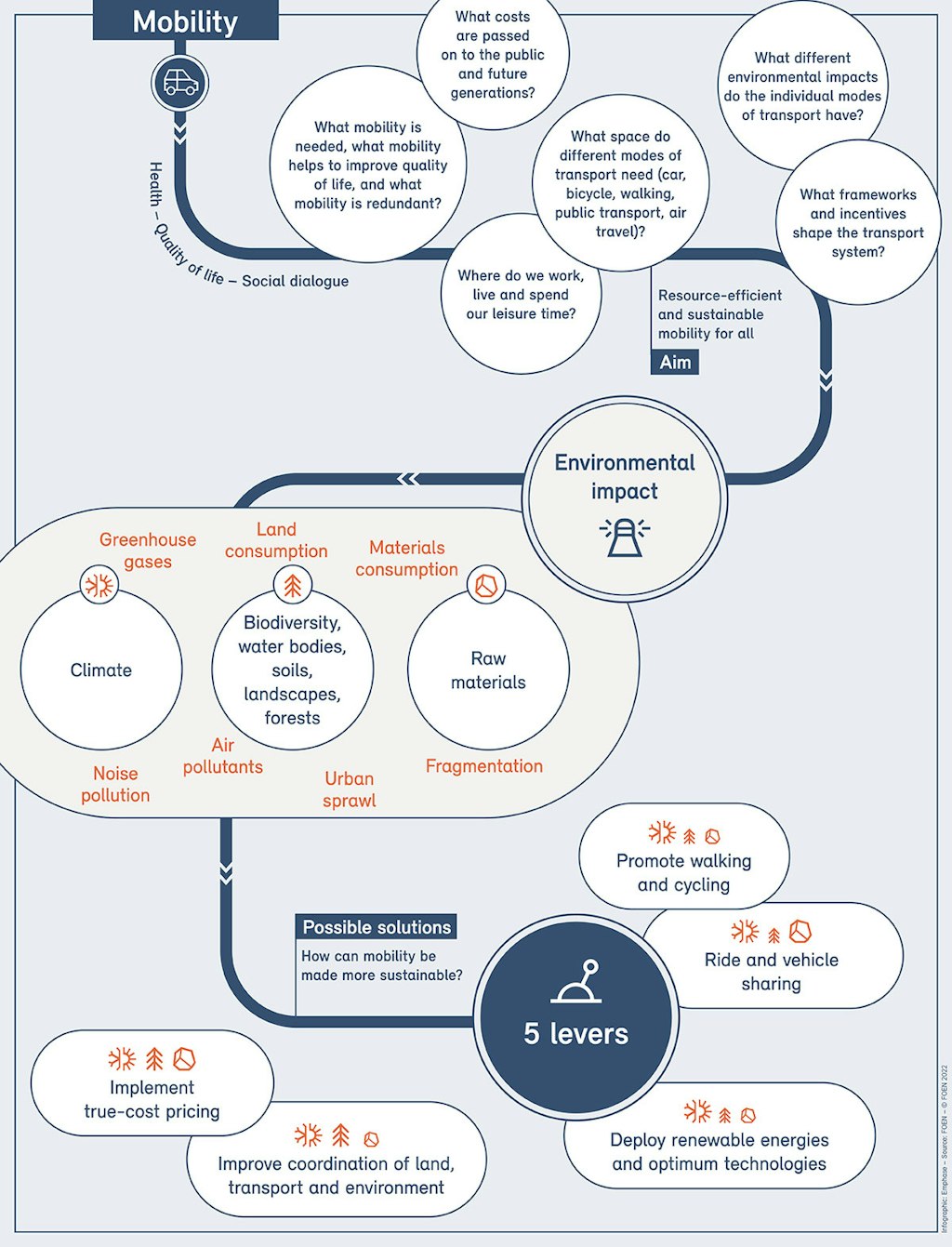Mobility is after nutrition and housing one of the areas of consumption and production with the greatest effects on the environment. A variety of levers and approaches can be used to make mobility more resource efficient and sustainable.