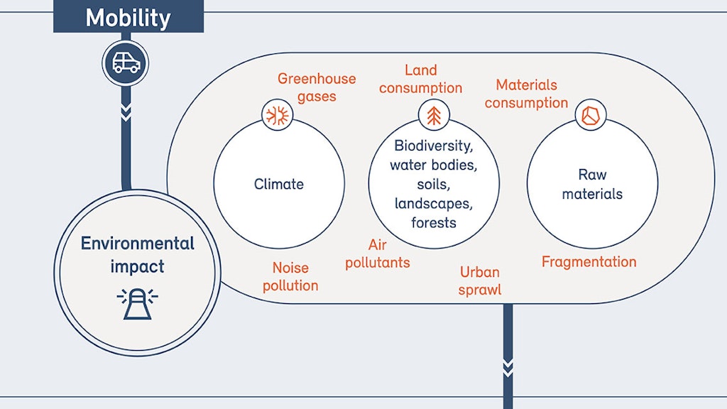 Mobility means quality of life. However, it also has a significant effect on human health and the environment. Its principal impacts include greenhouse gases, air pollutants, noise and its consumption of land and materials.