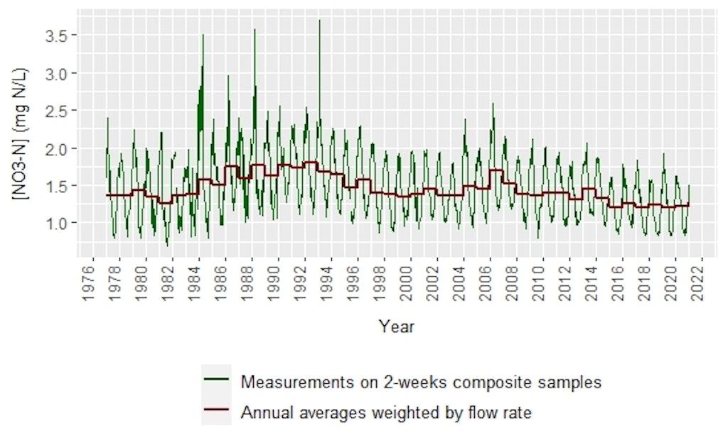 Nitrate, a compound of nitrogen and oxygen, accounts for the largest share of the nitrogen load that reaches the oceans via Swiss rivers. This excess nitrogen in the form of nitrate contributes to the overfertilisation of the oceans. In the Rhine near Basel, the nitrogen load from Switzerland decreased by about one third in the 1990s. However, it has changed very little since the 2000s. As a result, the reduction target for protecting the North Sea has not yet been reached. The picture is somewhat different for phosphorus; the loads in the Rhine have fallen below the reduction target.