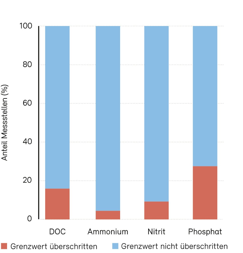 Nutrient pollution in watercourses has been drastically reduced in recent decades. The main reason for this is effective wastewater treatment, which is applied practically throughout the country. Ammonium and nitrite concentrations that are dangerous for fish have become rarer since the 1990s. However, every year local slurry spills cause acutely toxic nutrient concentrations that lead to the death of dozens of fish.