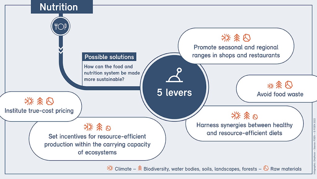 A variety of levers and approaches can be used to make food healthier and more resource-efficient. There is a great deal of potential to produce food in a more resource-friendly way and to rely on more sustainable and more plant-based products. This also benefits health. Other possibilities include setting the right financial incentives, adapting the range of food on offer in shops and restaurants, and reducing food waste.