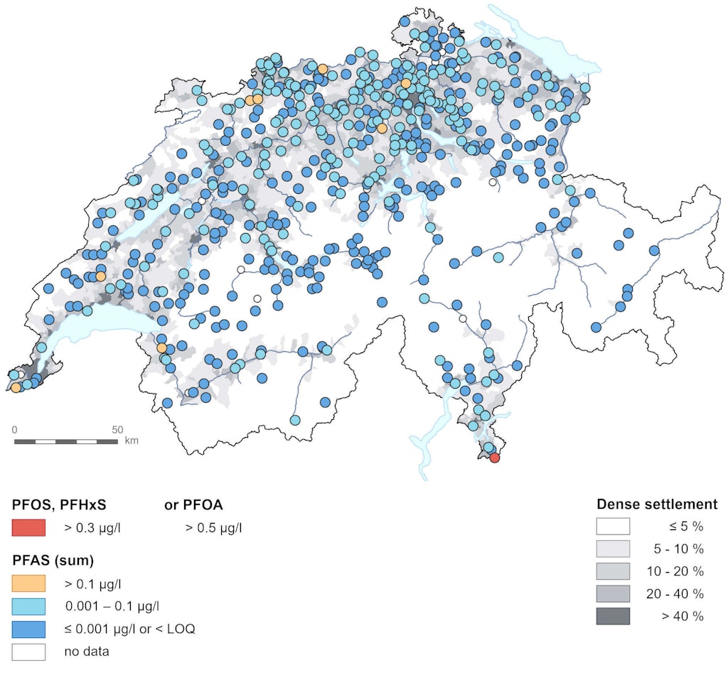 Per- and polyfluoroalkyl substances (PFAS) are found in Swiss groundwater at almost half of the NAQUA monitoring sites. PFAS concentrations exceeding 0.1 micrograms per litre in groundwater are frequently due to the use of firefighting foams containing PFAS. These chemicals can also reach groundwater from landfill sites or via infiltration of river water.