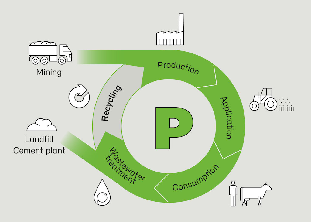 Phosphorus is vital to life on earth. Plants, animals and humans need it to grow and produce energy. We have greatly exceeded the planetary boundary for the phosphorus cycle. Currently, the phosphorus cycle in Switzerland is not closed. In the past, sludge was used as a fertiliser in agriculture. Although this returned the phosphorus to the cycle, there are risks associated with the direct spreading of wastewater sludge as fertiliser. Owing in part to the BSE crisis (mad cow disease), there has been a ban in place since 2006 and the sludge must undergo thermal treatment through incineration. The phosphorus used in agriculture is currently mined from rocks in the form of phosphate, processed into a fertiliser and imported before it is applied to Swiss fields. In the fields, the nutrient is absorbed by plants, which in turn serve as food for humans and animals. The human body absorbs phosphorus as we consume animal and plant-based foods. The nutrient is then excreted and largely ends up in the waste water system. The sludge resulting from waste water treatment is incinerated and the phosphorus it contains ends up either as sludge ash or slag in landfills, or in cement plants, where sewage sludge and animal and bone meal are used as alternative fuels.
