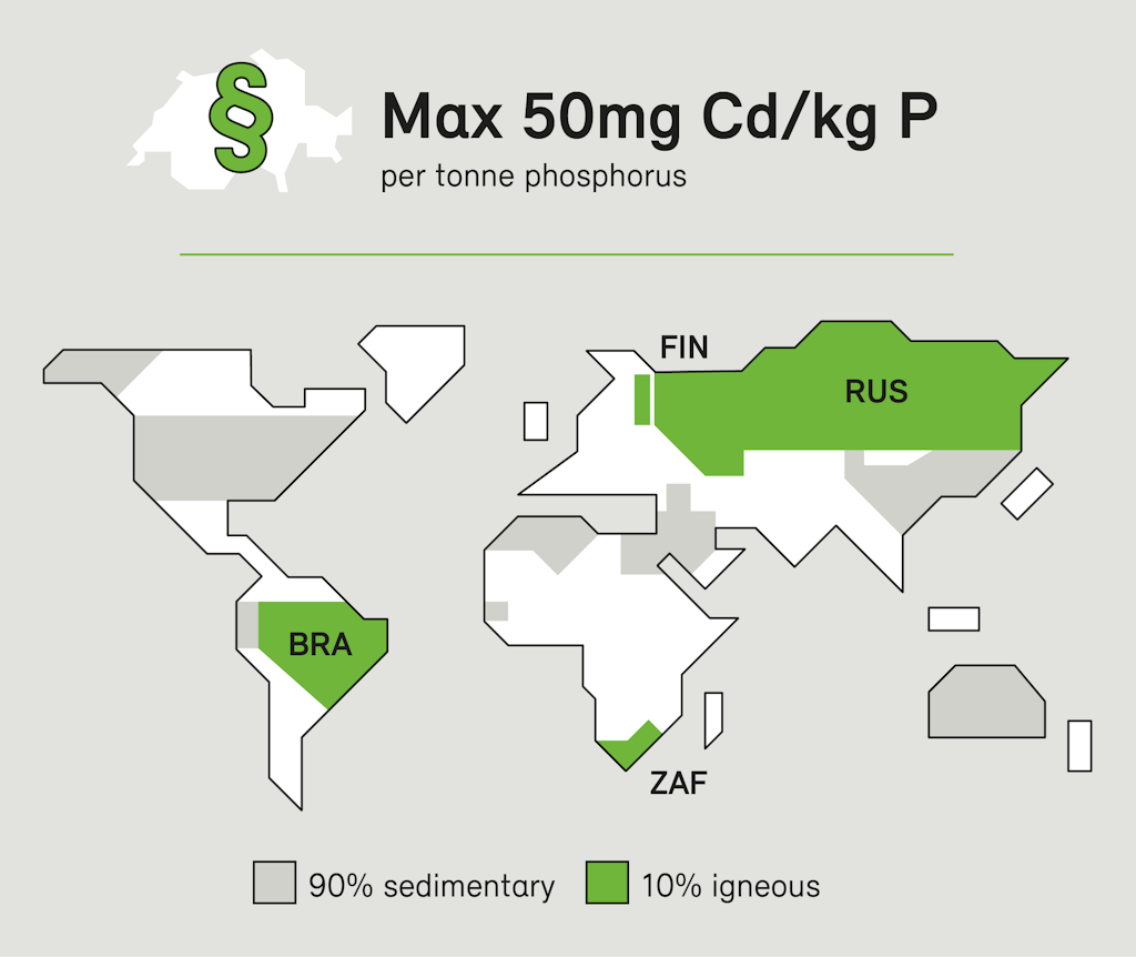 Marine sedimentary phosphate deposits have a higher phosphate content than igneous ore deposits. However, the former also contain high levels of impurities, such as cadmium and uranium. Switzerland has very strict limits on the concentration of heavy metals in mineral fertilisers, so it relies mainly on igneous phosphate deposits with low cadmium content and can only source phosphorus for fertiliser production from certain mines. For this reason, Switzerland has until now imported much of its mineral phosphorus fertiliser from Russia. With the war in Ukraine this is no longer possible, which has again highlighted the issue of Switzerland's reliance on imports and the importance of an independent supply of phosphorus.