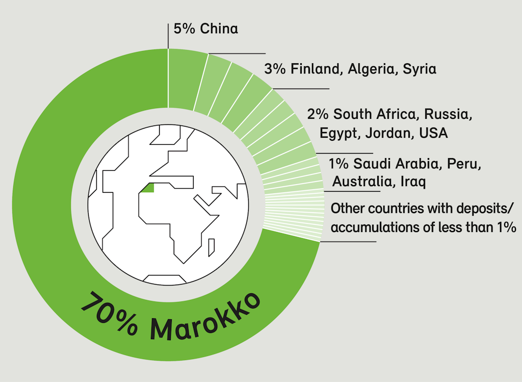 Phosphorus (P) occurs almost exclusively in nature in oxidised form as a phosphate (P2O5). Phosphate mining is the extraction of rocks containing phosphates (phosphate ores). Most of these phosphate ores are of sedimentary marine origin, but there are also lesser phosphate deposits in igneous rocks. Although sufficient phosphate ores are available in the medium term, the deposits are concentrated in a small number of countries (e.g. Morocco, China, Russia) and geopolitically unstable regions. In addition, depending on the location, phosphorus extraction can have a serious impact on people and the environment.