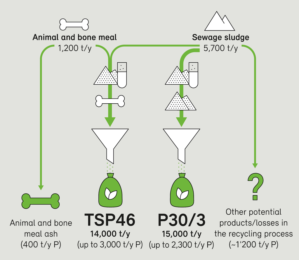 Each year, some 6,900 tonnes of phosphorus could potentially be recovered from Swiss waste streams. Sludge is the most important source of phosphorus-rich waste. About 5,700 tonnes of phosphorus ends up in sewage sludge each year. Today, phosphorus can be recovered most effectively from wastewater, sewage sludge and sewage sludge ash. Sewage sludge must always be thermally treated in accordance with the ban on direct spreading of sludge in agriculture. Animal by-products are the second major phosphorus-rich waste stream (animal and bone meal). Around 1,200 tonnes of phosphorus are lost annually via this waste in Switzerland's waste management sector. Compared to sewage sludge, animal by-products have high phosphorus concentrations and low levels of impurities. This makes the phosphorus in animal by-products easy to recycle from a technical perspective. By achieving a recovery rate of 80%, Switzerland could produce enough recycled phosphorus to cover just under 40% of its annual consumption.