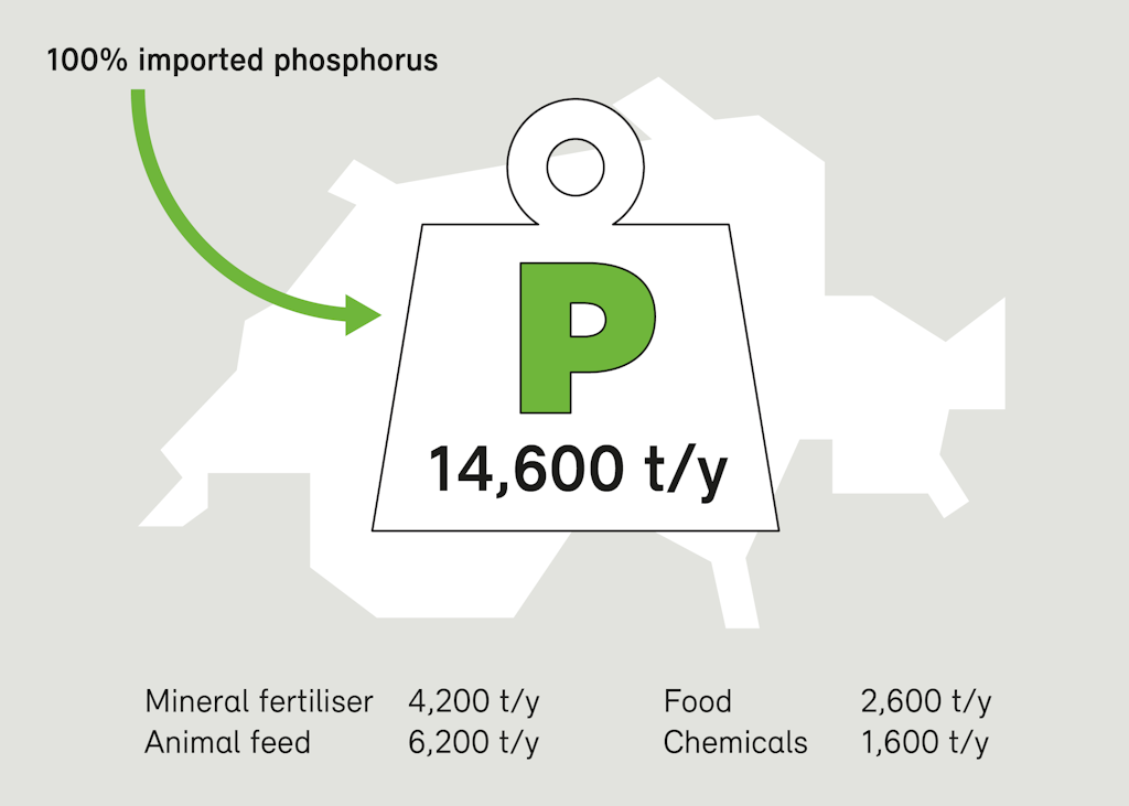 Switzerland's net phosphorus imports amount to 14,600 tonnes each year as mineral fertiliser (4,200 tonnes), in animal feed (6,200 tonnes), foodstuffs (2,600 tonnes) and chemicals (1,600 tonnes). As there are no primary phosphorus deposits in Switzerland, the country must import phosphorus from abroad in order to cover its current requirements, in particular the demand for phosphorus fertiliser. This overreliance is a cause for concern. The direct application of sludge containing phosphorus onto agricultural land has been banned since 2006. While this prevents pollutants from entering the soil, it also interrupts the cycle of phosphorus back into agriculture.