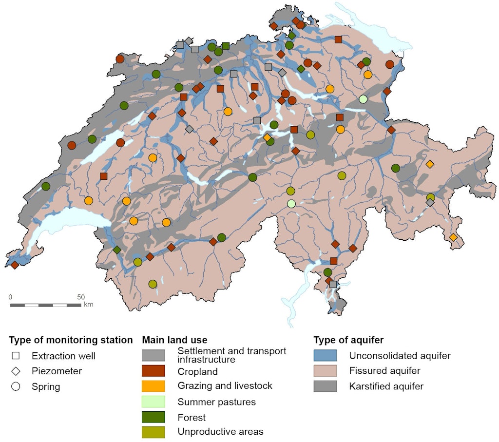 QUANT monitors groundwater quantity in Switzerland's characteristic water resources in terms of groundwater levels and spring discharges. Water temperature, electrical conductivity and, to some extent, turbidity are continuously recorded as well.