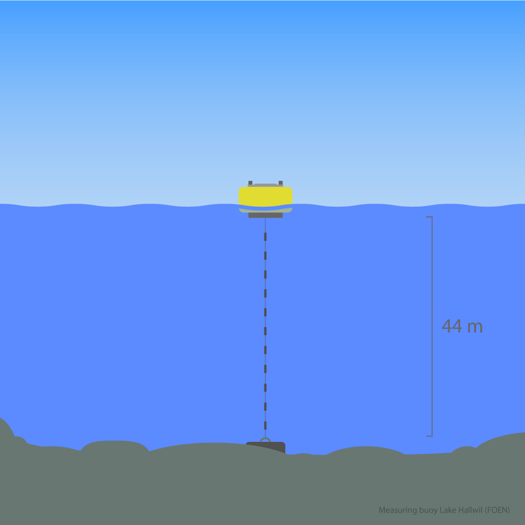 Cantonal data from periodic sampling has been available for Lake Murten since 1990 (Canton Fribourg). A monitoring site was selected at the deepest point of Lake Murten in order to be able to take measurements at all depth levels. Boat navigation is not affected by the data buoy.