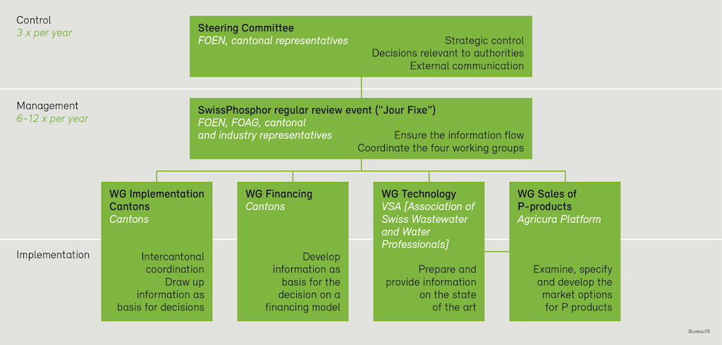 The SwissPhosphor platform is organised in accordance with the federal HERMES standard. Various working groups develop the content. These are made up of representatives of the federal and cantonal authorities, plant operators and various stakeholders. The SwissPhosphor platform is coordinated at the regularly scheduled meetings of representatives of the individual working groups. The steering committee makes strategic decisions and is composed of representatives of the cantonal and federal government authorities.