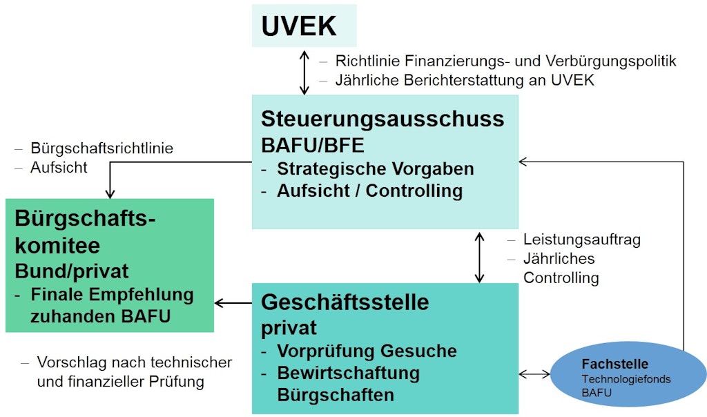 Applications will be examined both in terms of their technological suitability as well as the company's financial structure and viability in accordance with the Steering Committee's strategic requirements. A guarantee committee composed of representatives of the Confederation and the private sector assesses applications on behalf of the FOEN. The operational supervision rests with the Steering Committee, which consist of a member of the Federal Offices of the Environment (FOEN) and Energy (BFE). As a point of contact and to support the committee the FOEN operates a specialized technology fund. The principles of awarding the guarantee and the organization are determined by DETEC.