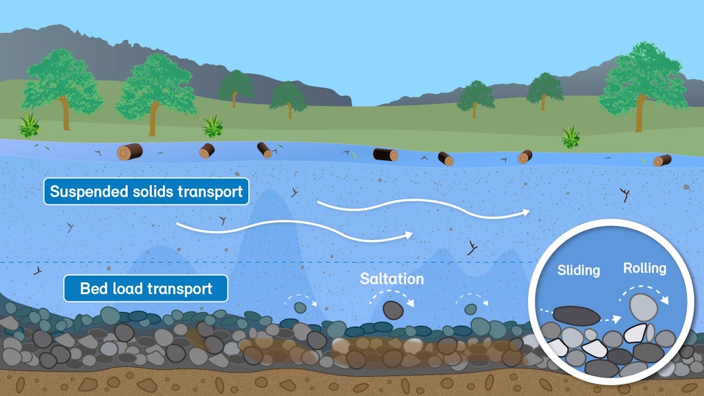 Sediment refers to all solid substances that are transported or deposited in water. In rivers and streams, it occurs in three forms: as suspended load, as bed load, and as floating debris. Of these, suspended load typically makes up the largest component of sediment.