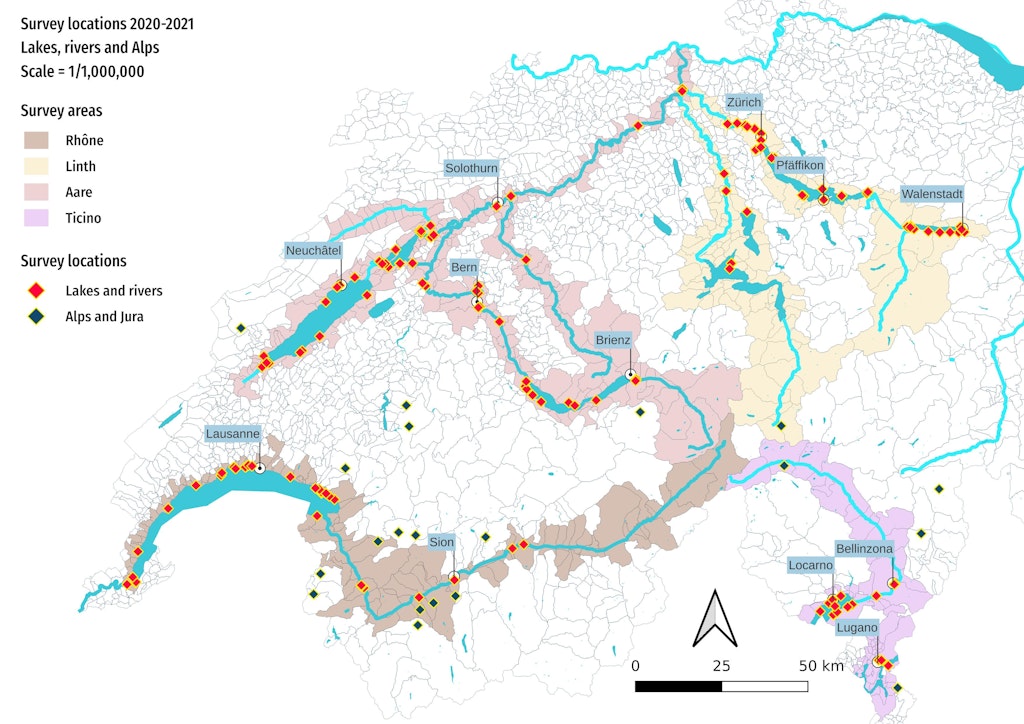 Dozens of volunteers combed 143 river and lake sites in different parts of the country between March 2020 and May 2021. They collected all visible waste items and classified them according to a detailed code system. They examined riverbank sections in four areas of focus along the Aare, Rhone, Ticino and Limmat Rivers, as well as selected tributaries and lakes linked to these areas.