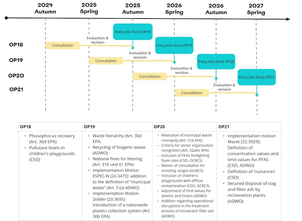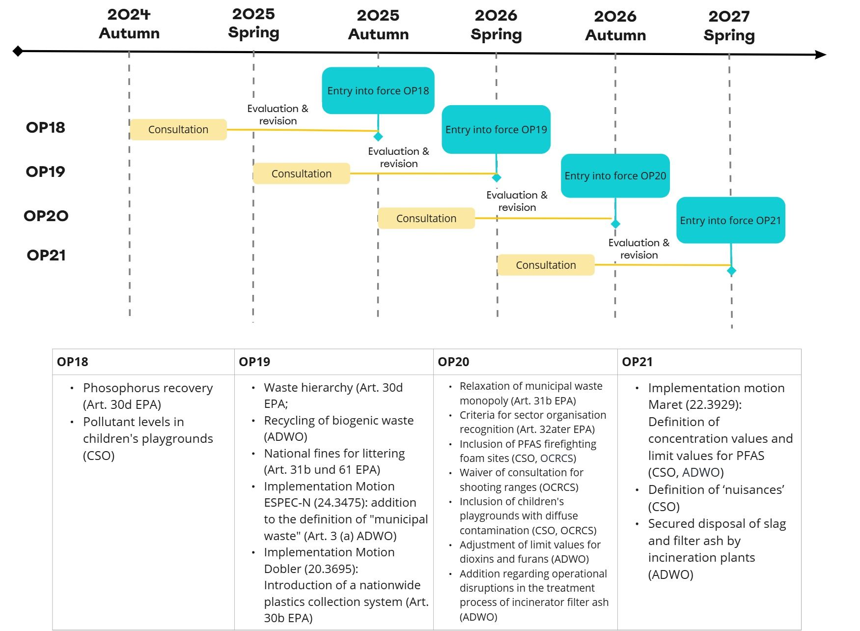 The revised ordinances will be put out for consultation in a staggered manner. The consultation on the provisions relating to the relaxation of the municipal waste monopoly and the recognition of private sector organisations is planned for spring 2026. The implementation of the Dobler motion (20.3695) and the introduction of a standardised nationwide collection scheme for plastics will take place with the revision of the Packaging Ordinance (VerpV). The changes under Ordinance Package 19 (OP19) are expected to come into force mid-2026, while those under Ordinance Package 20 (OP20) are expected to come into force at the end of 2026.
