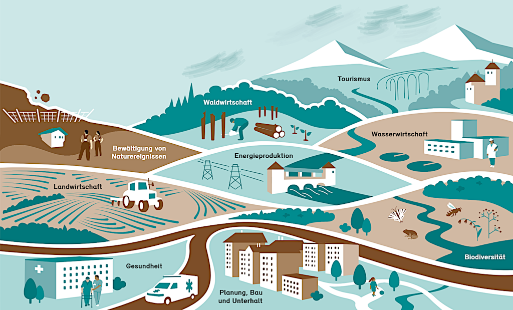 En conséquence du réchauffement climatique, les communes suisses font face à des défis majeurs. L’outil en ligne de l’Office fédéral de l’environnement en matière d’adaptation porte sur les domaines suivants :