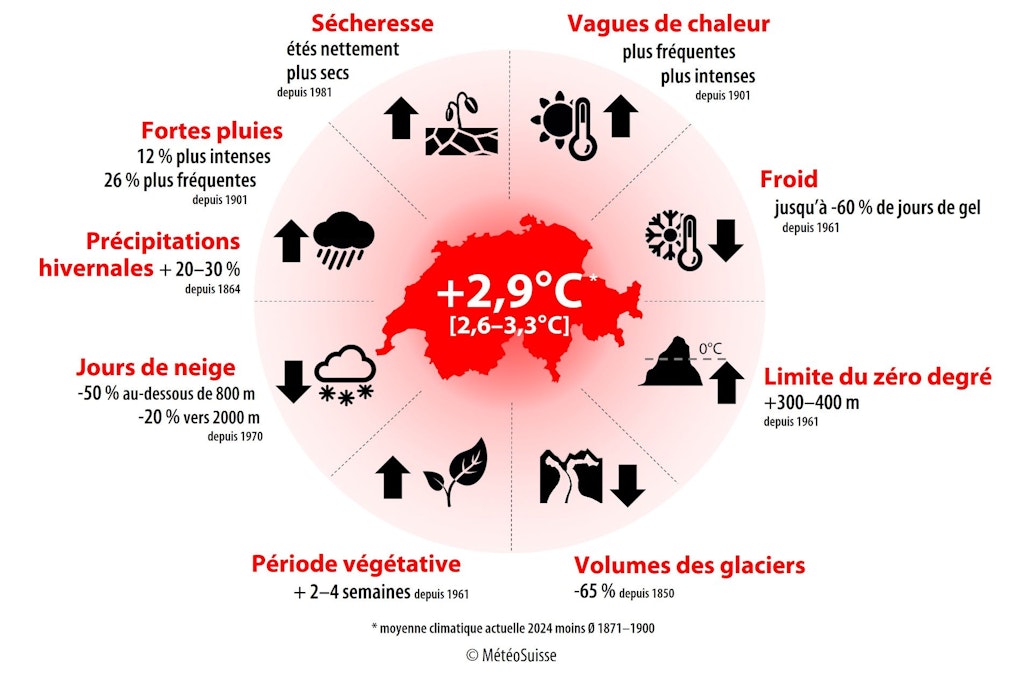 Avec les changements climatiques, les risques tels que les vagues de chaleur, les sécheresses estivales et les fortes précipitations augmentent aussi en Suisse.