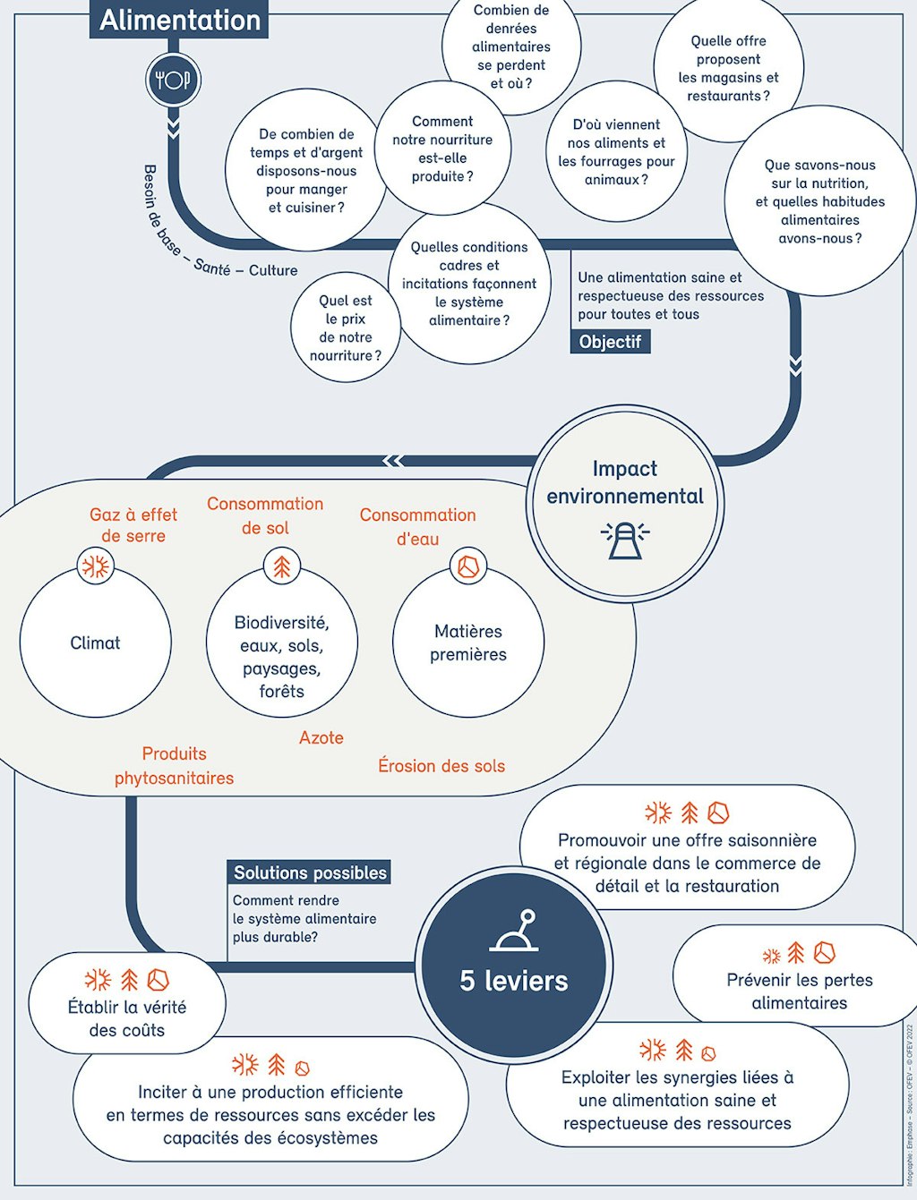 L'alimentation - avant le logement et la mobilité - est le secteur de consommation et de production qui a le plus grand impact environnemental. Grâce à différents leviers et pistes d’action, il est toutefois possible de rendre l’alimentation plus saine et plus respectueuse des ressources.
